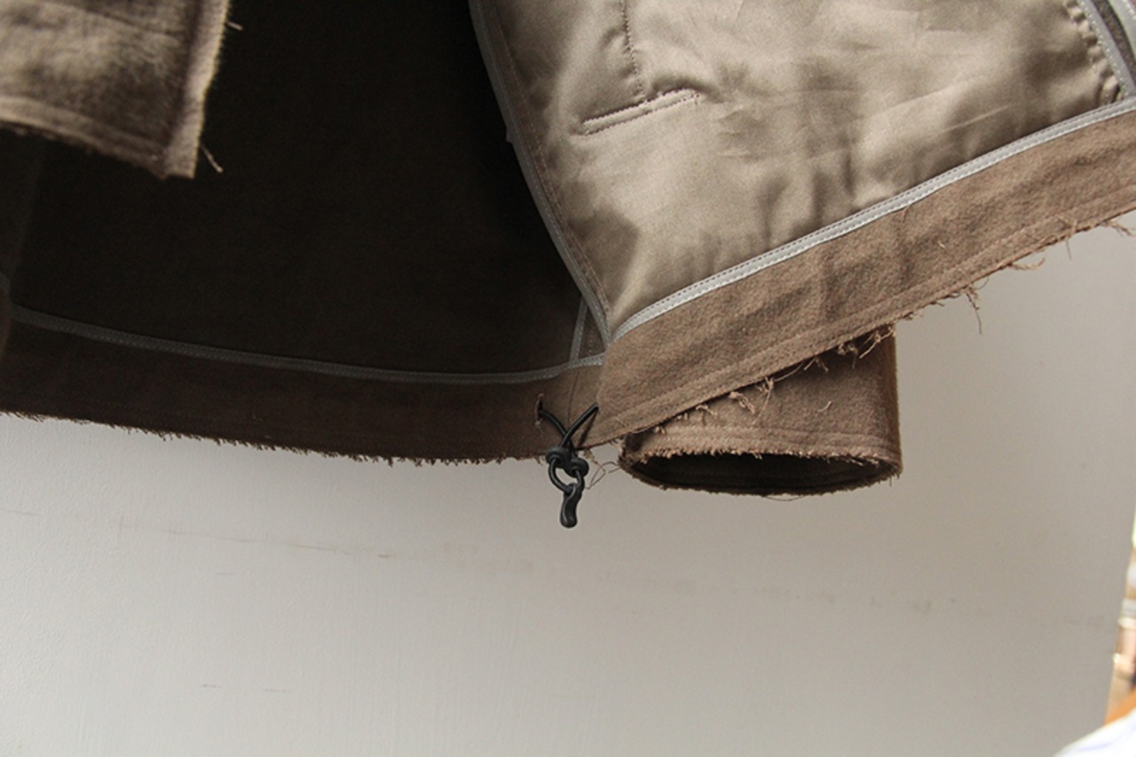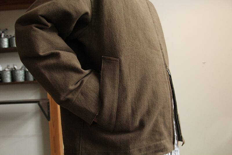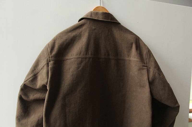太番手の糸を使い限界まで目を詰めて織上げた後に繊維の中から糸を引き出し起毛することで嵩高い風合いに仕上げている。
