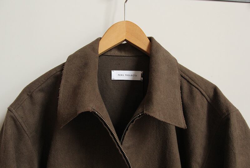 生地の端を断ち切りにすることで、縫い代が薄く仕上がりをシャープな見え方にしている。ショート丈のボックスシルエットでシーズンを選ばず着ることができる。