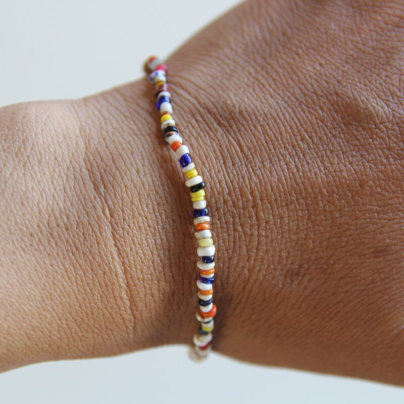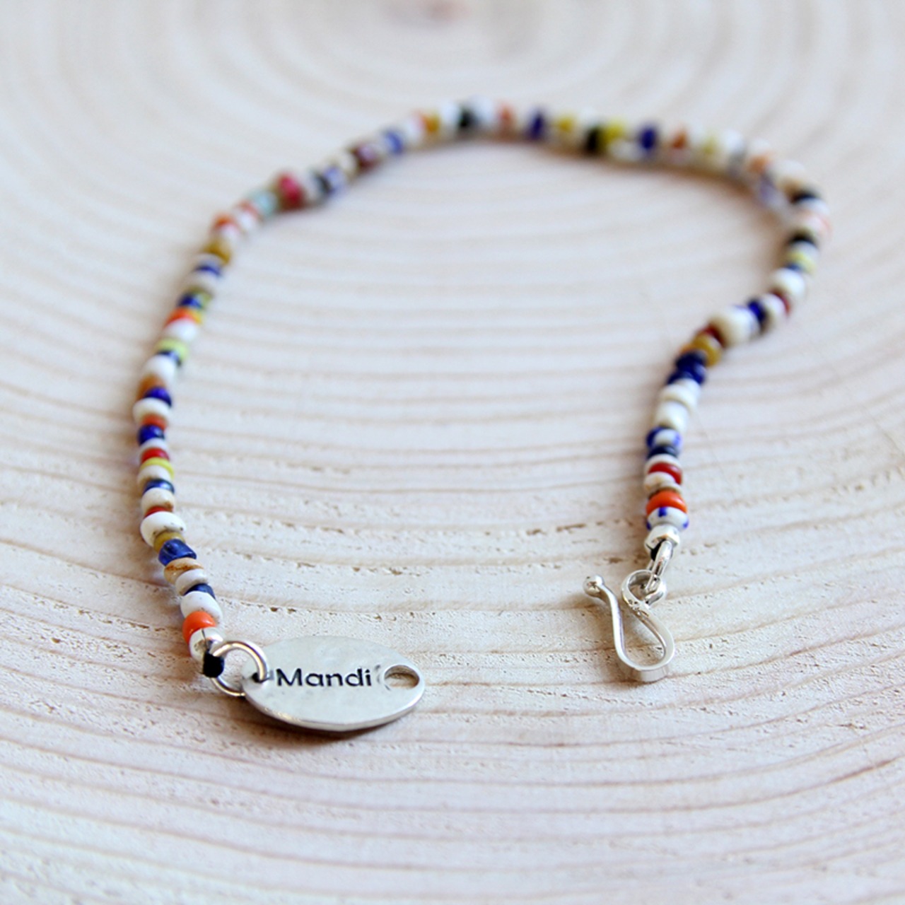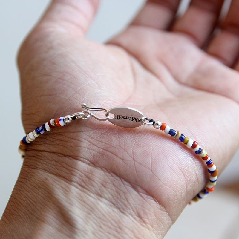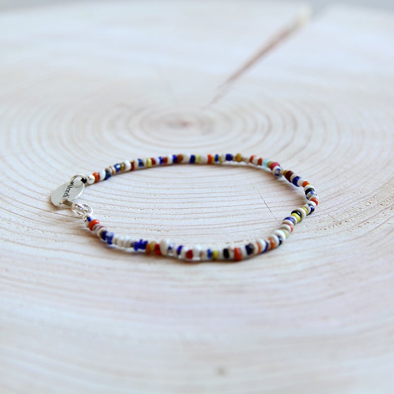 落ち着いた色合いのアンティークのレッドビーズを使用。ミックスカラーで小さめサイズのビーズなのでコーディネートのし易さが魅力のブレスレットです。