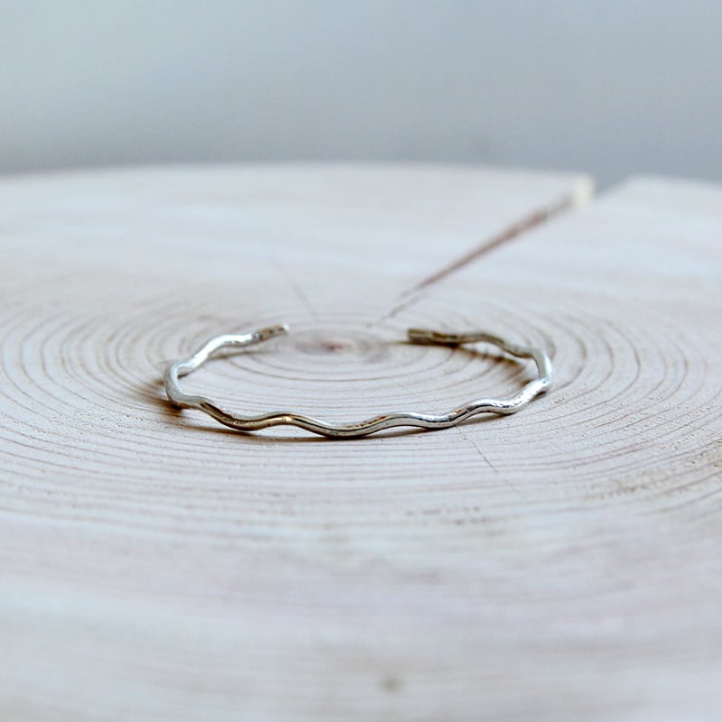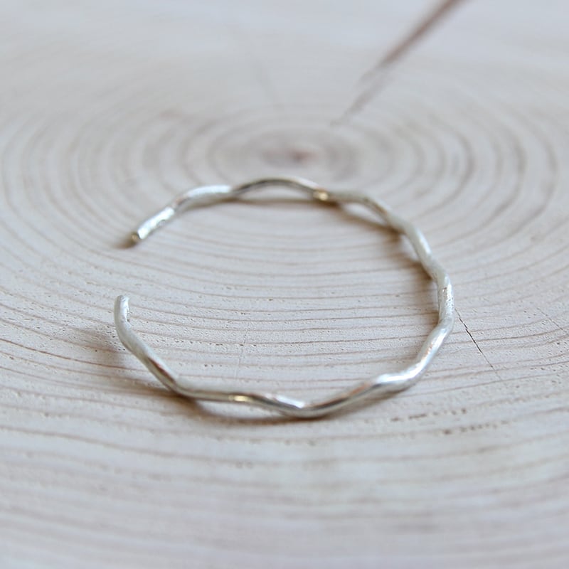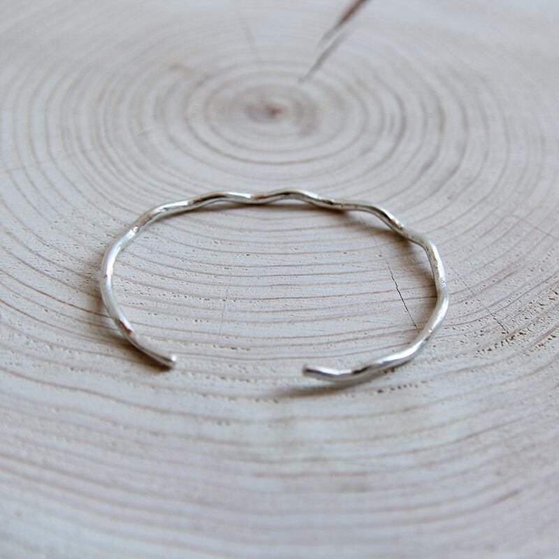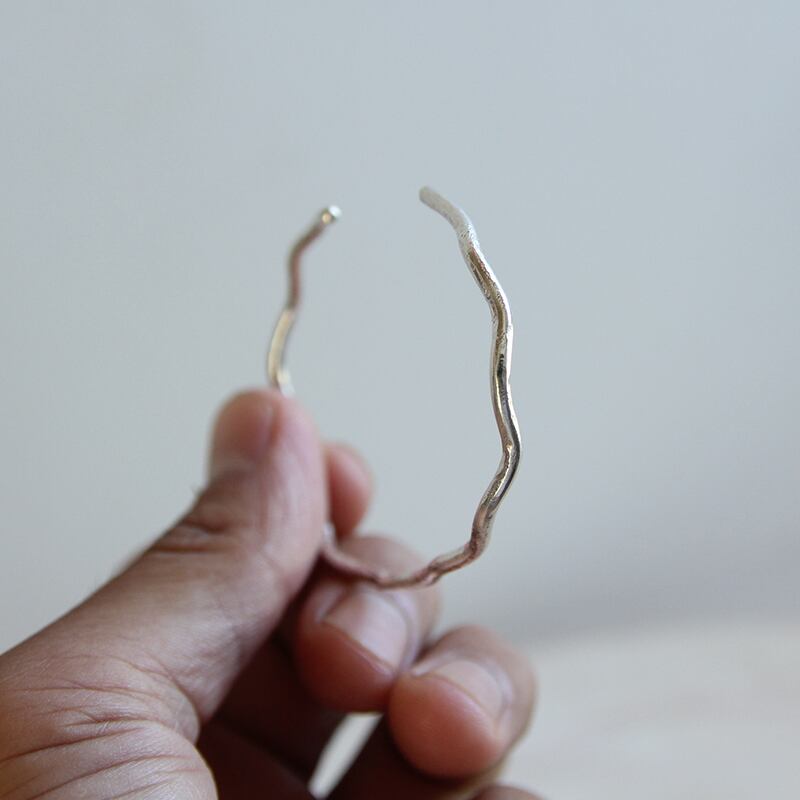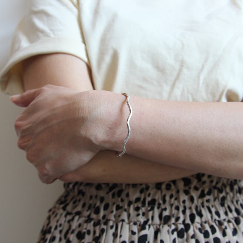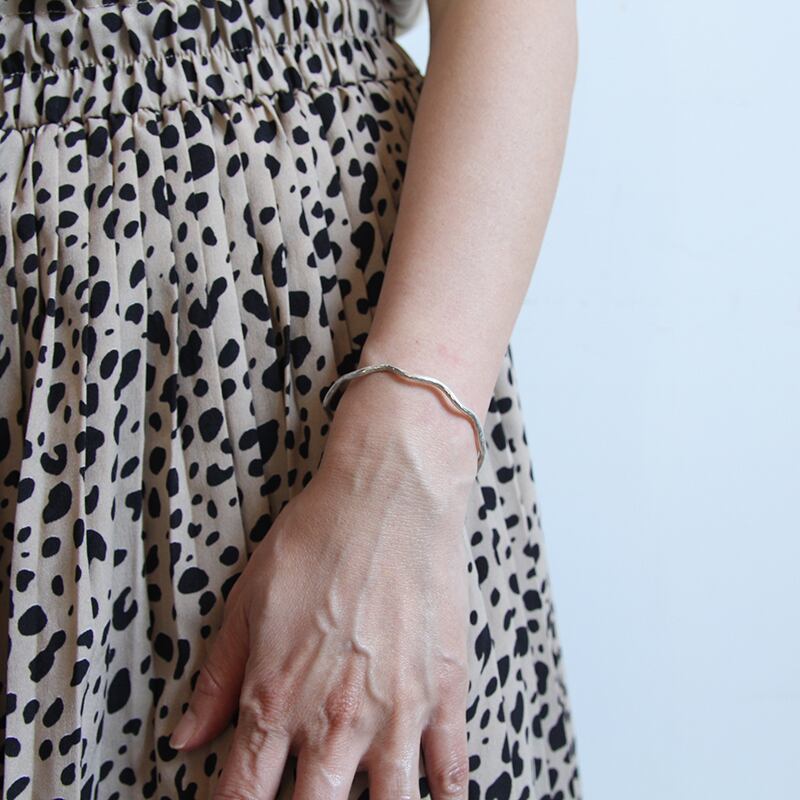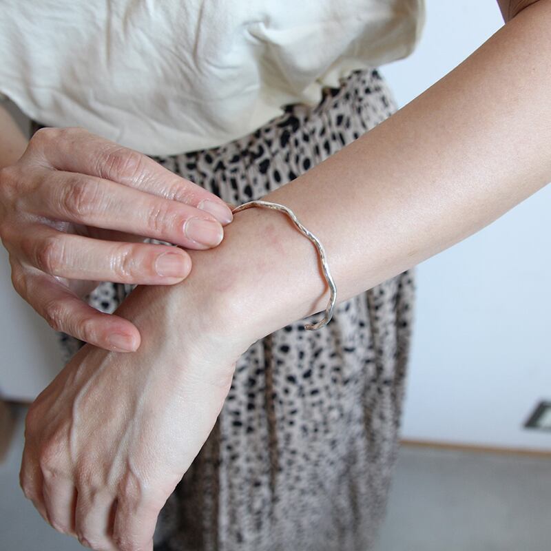 表面のハンマー加工で軽やかで上品な仕上がりとなっています。さらりと単品で着けても、他のアイテムとの重ね付けにも重宝するアイテム。コーディネートを選ばず毎日着用できるバングルです。