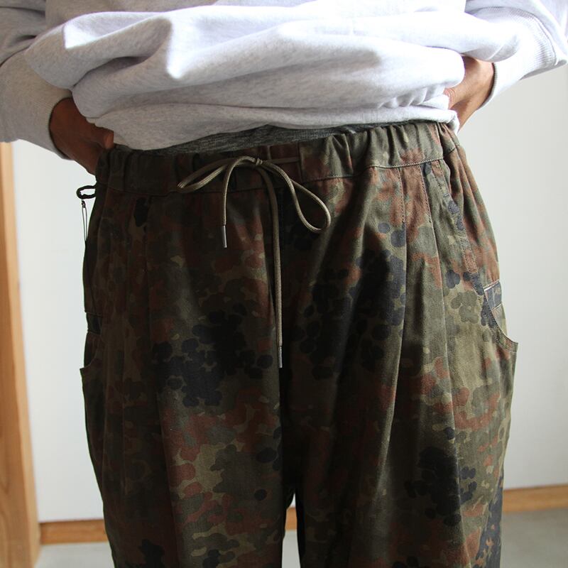 ドイツ軍独特の迷彩パターンである絵の具を垂らしたような柄が特徴的なフレクターカモにオーバーダイを施し落ちついた表情に仕上げている。