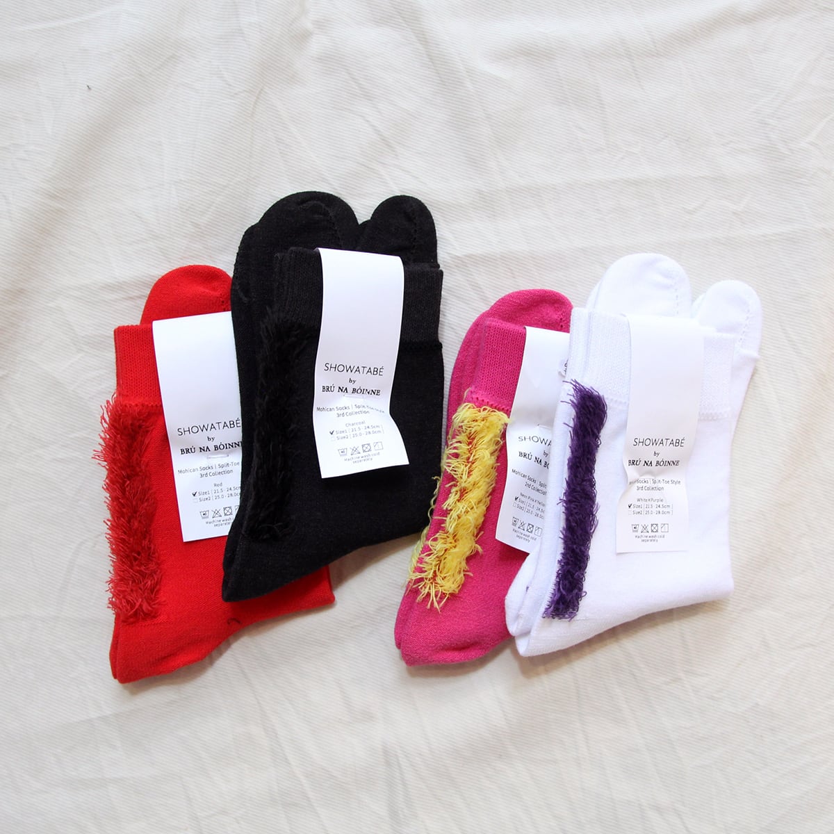 レッグの後ろ側にモヒカンヘアを思わせるデザインを施し、つま先もタビ型にしたユニークなデザインの靴下。