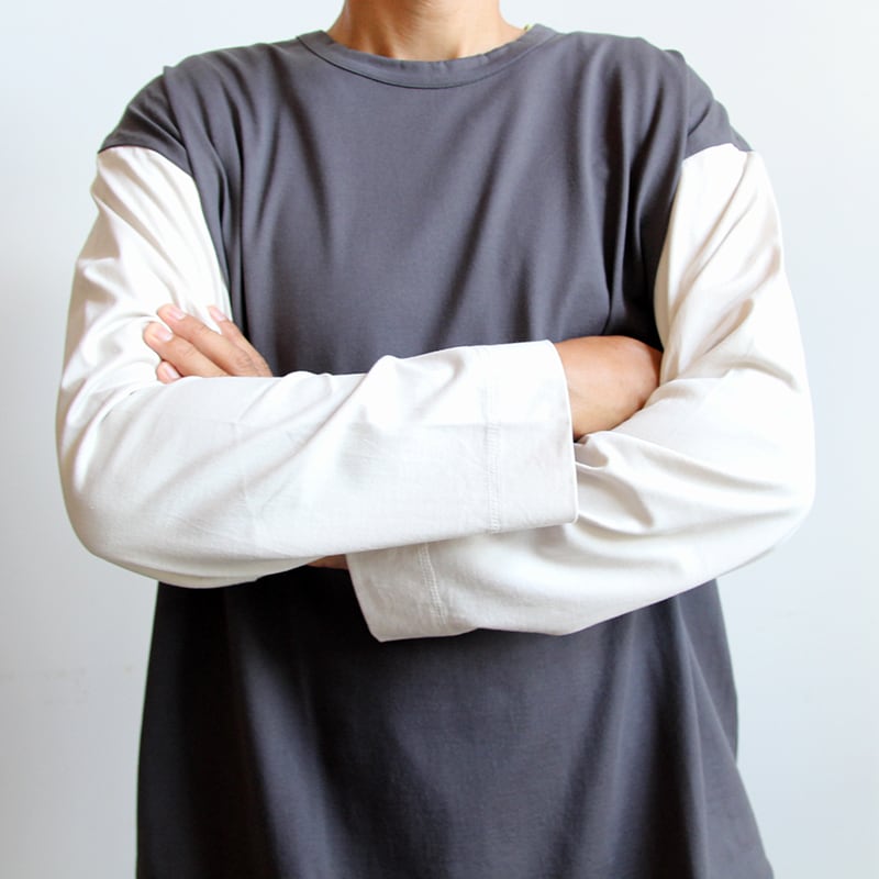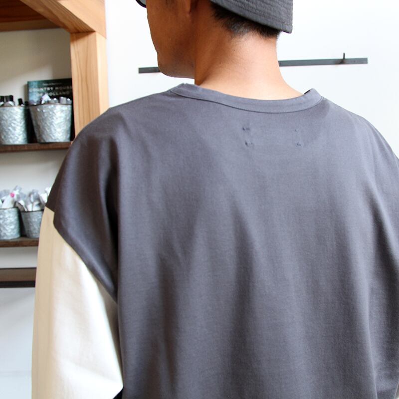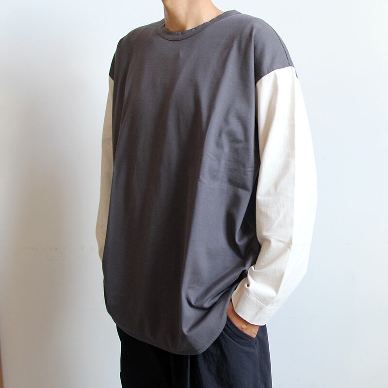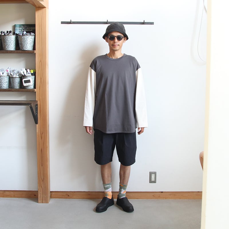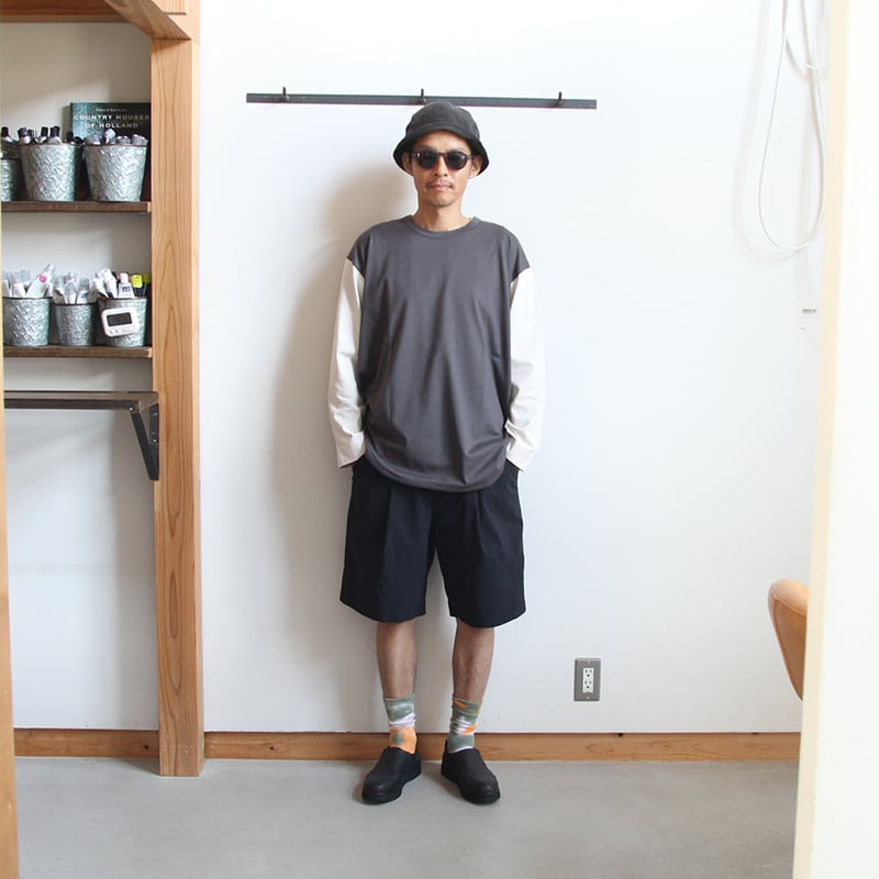 通常メリハリの効いた色で切り替える事が多いベースボールTを、くすんだ色で切り替えることで落ち着いたモダンな表情に仕上げている。