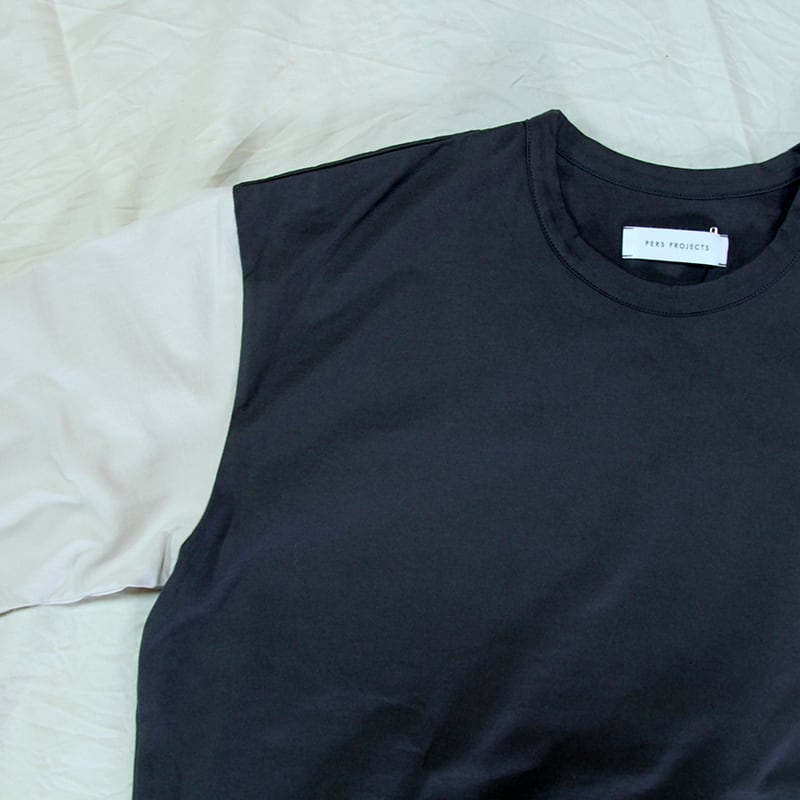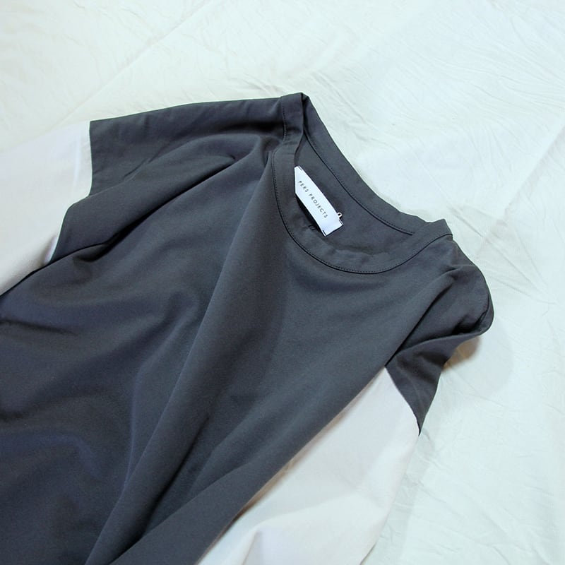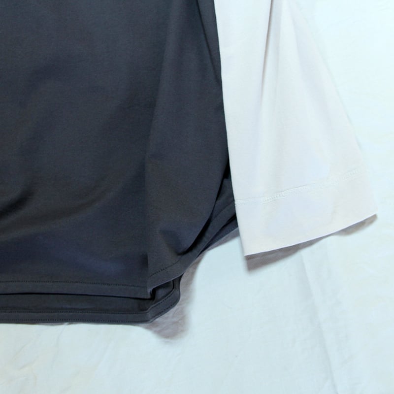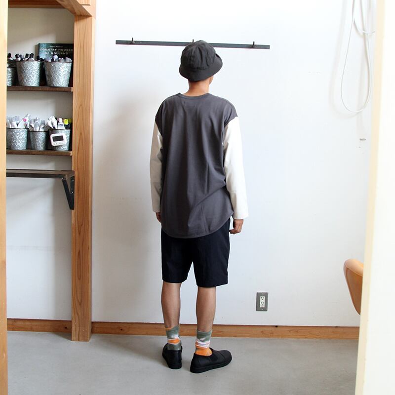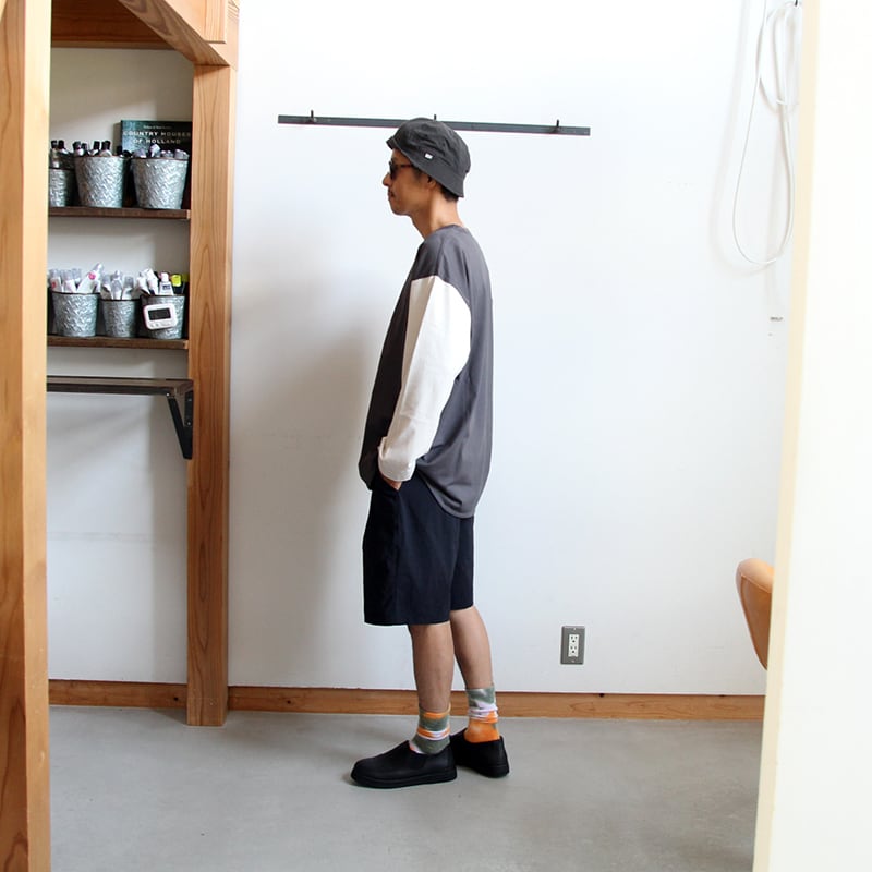 通常メリハリの効いた色で切り替える事が多いベースボールTを、くすんだ色で切り替えることで落ち着いたモダンな表情に仕上げている。