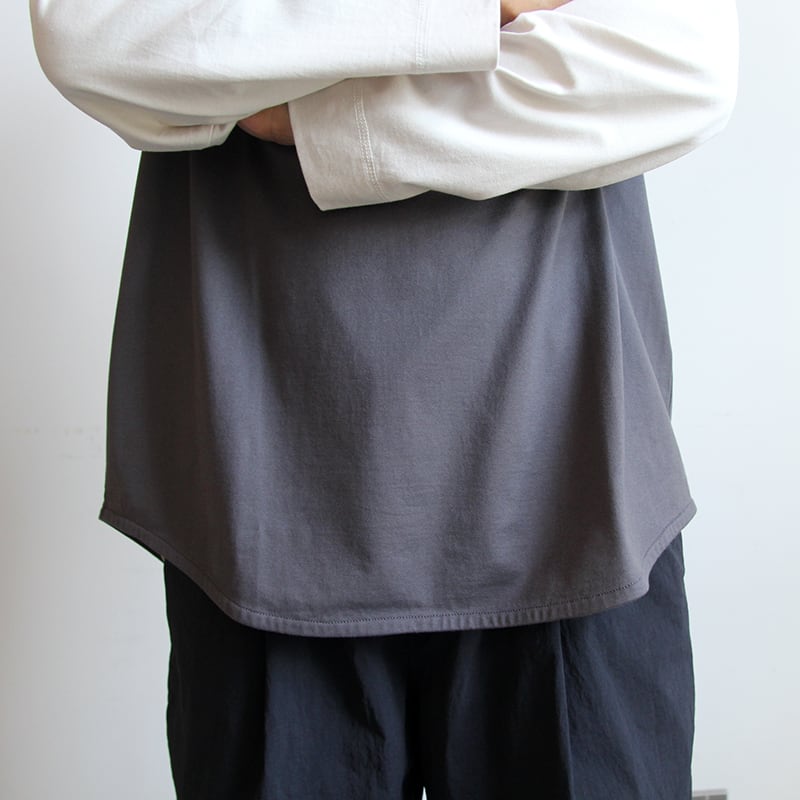 展示会で見た時にセットインの袖付け切り替えに惹かれ、しっかりとした生地感でありながら滑らかな肌当たり、古着のような着込んでくすんだカラー、自分の好きな裾のラウンドもポイント高く、即デザイナーに相談し別注が決まりました。