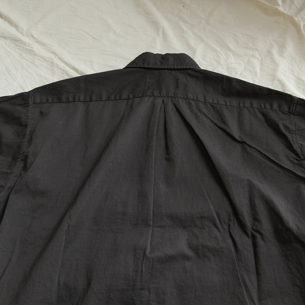 ドレスシャツに使われるシングルニードル製法で仕上げた後に、あえて製品染を施している。