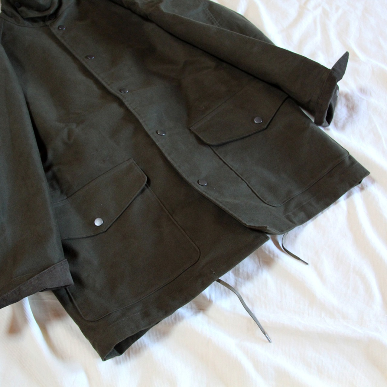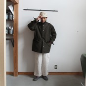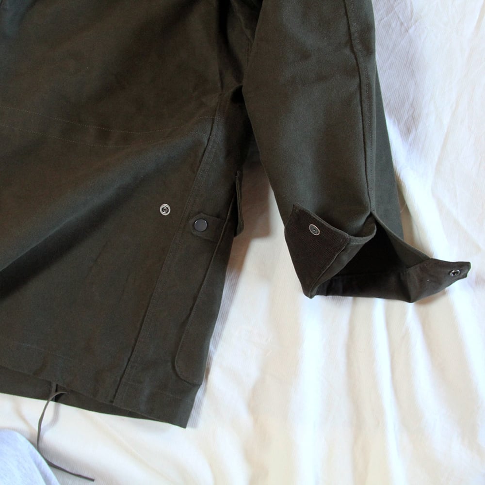 ウェスト、裾はコードでシルエット調整が可能。 衿にチンストラップ。