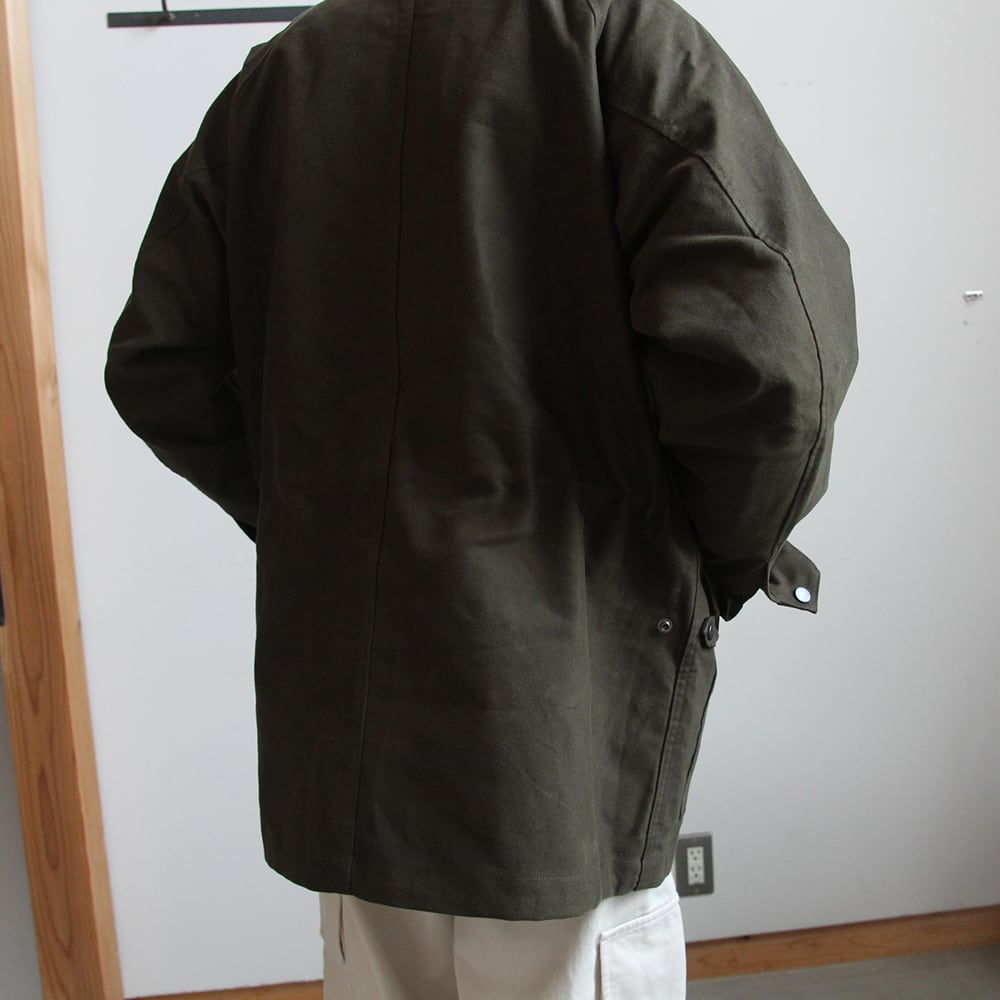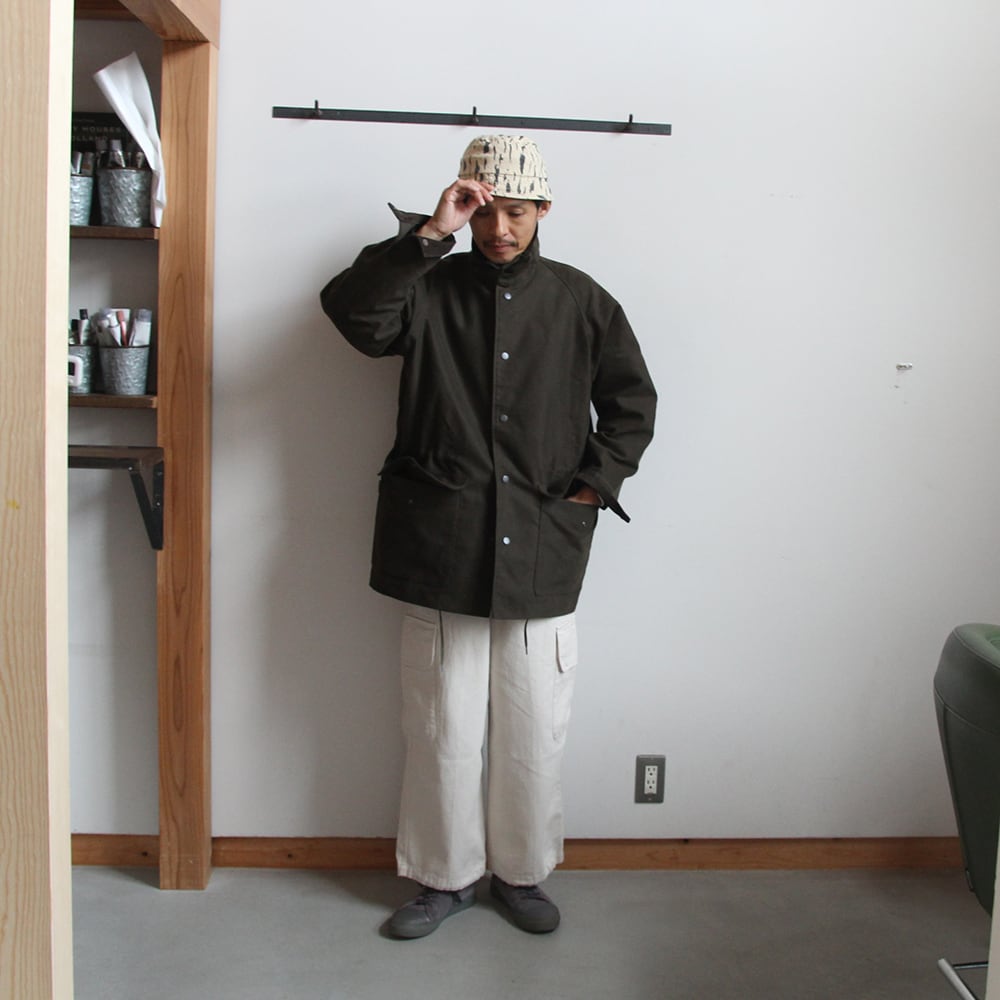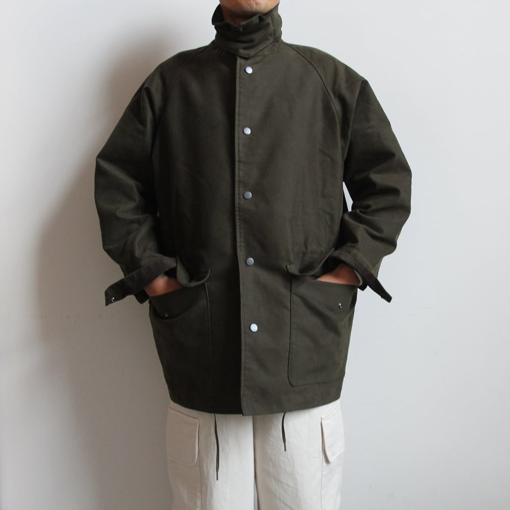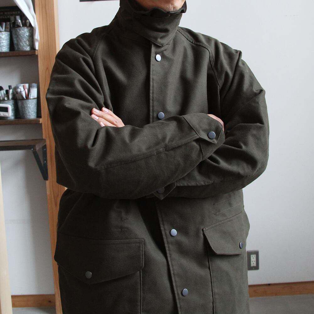 ライディングコートをモチーフにたっぷりと身巾をとり、ハンティングジャケットの要素を取り入れハーフ丈で仕上げている。