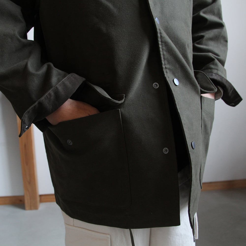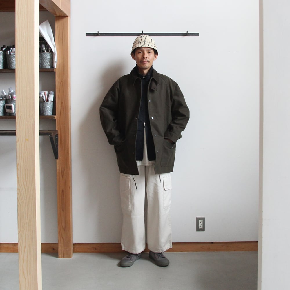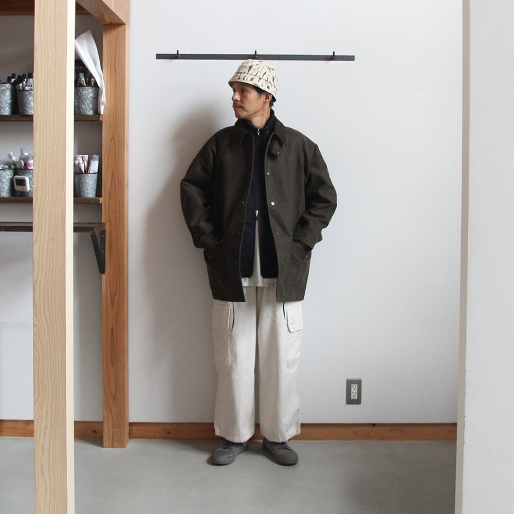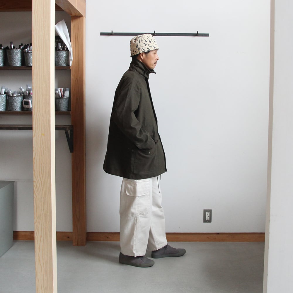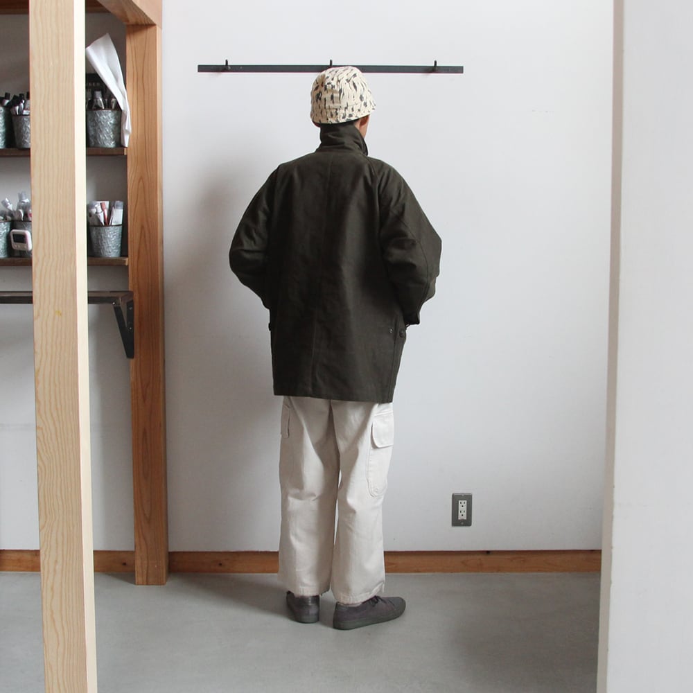 ライディングコートをモチーフにたっぷりと身巾をとり、ハンティングジャケットの要素を取り入れハーフ丈で仕上げている。