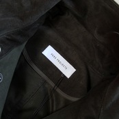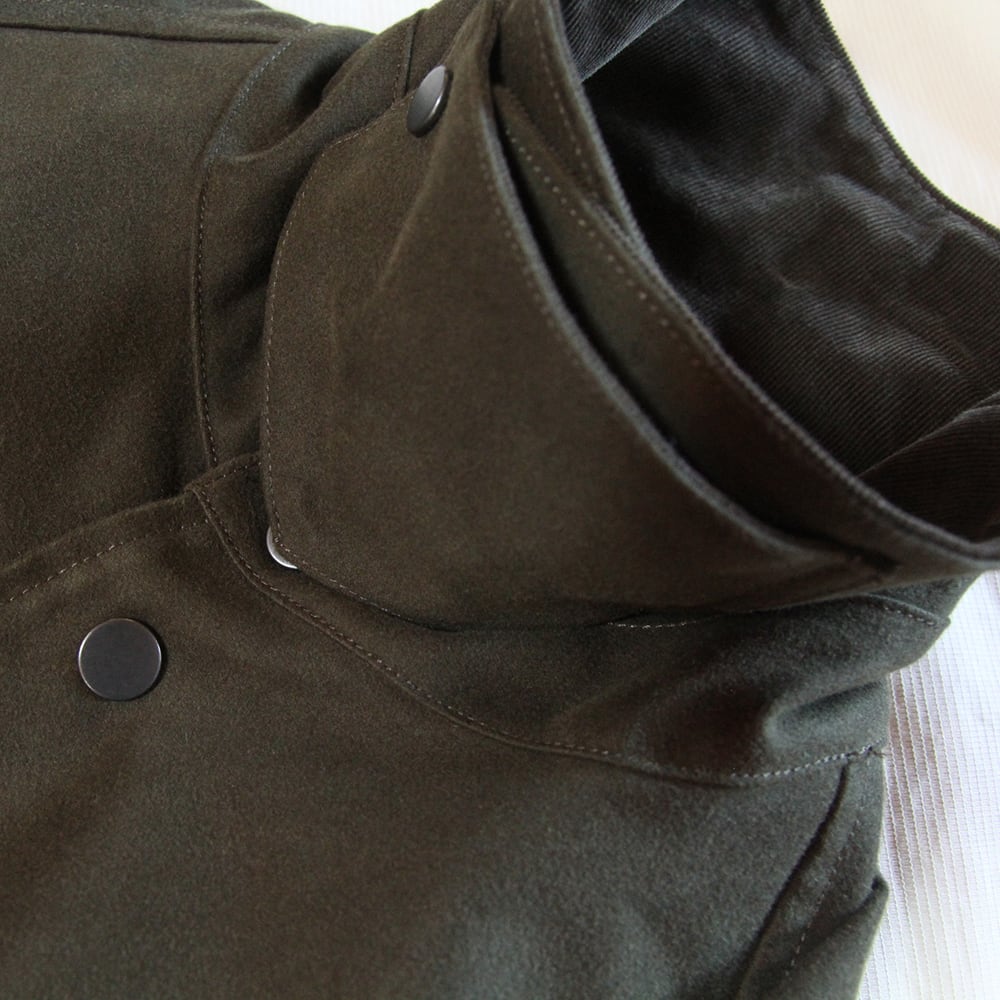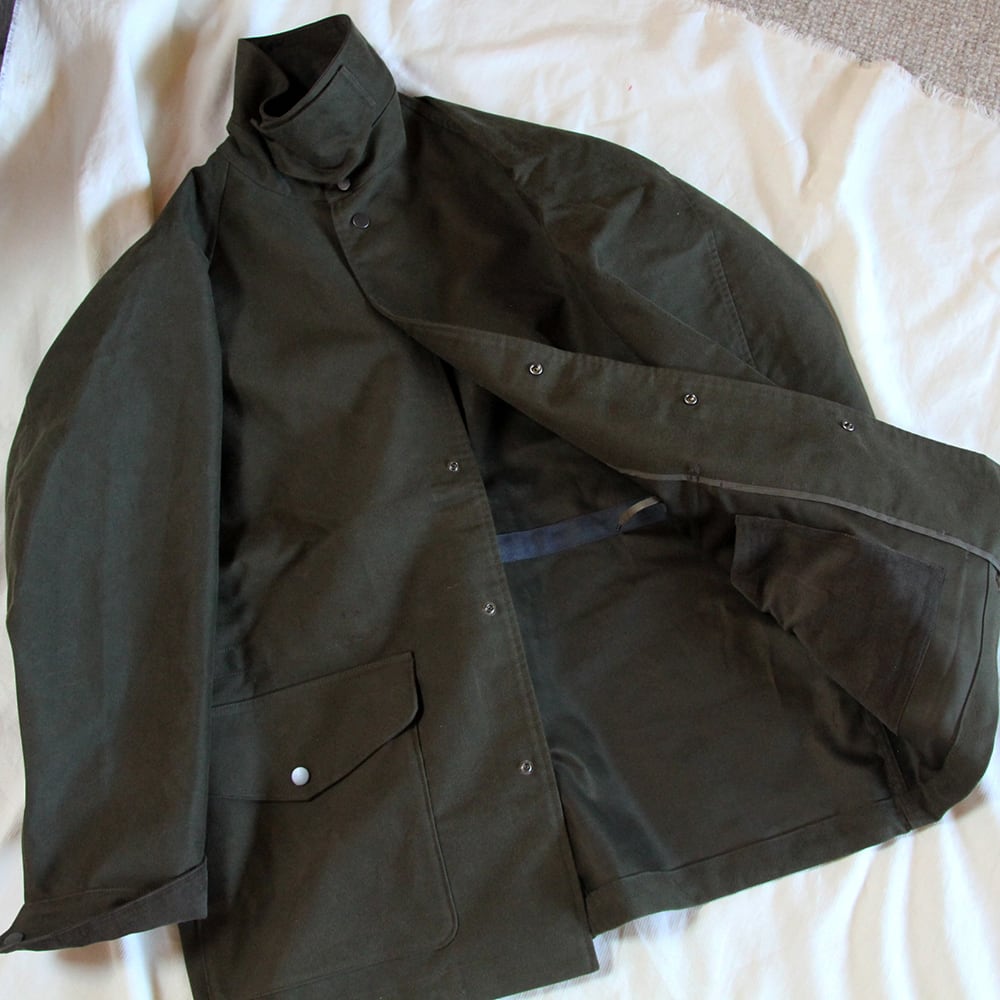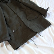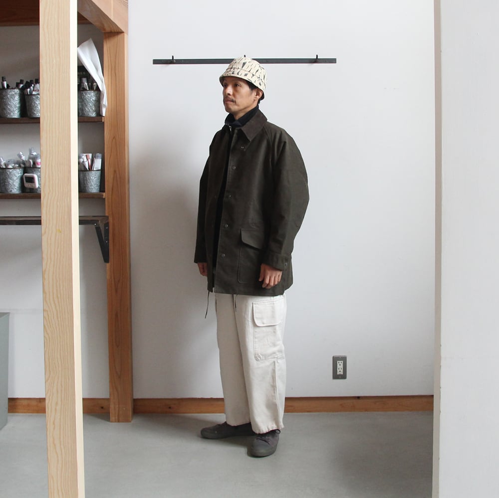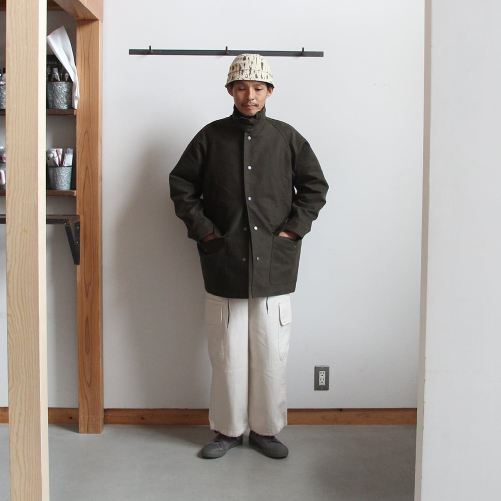 ライディングコートをモチーフにたっぷりと身巾をとり、ハンティングジャケットの要素を取り入れハーフ丈で仕上げている。