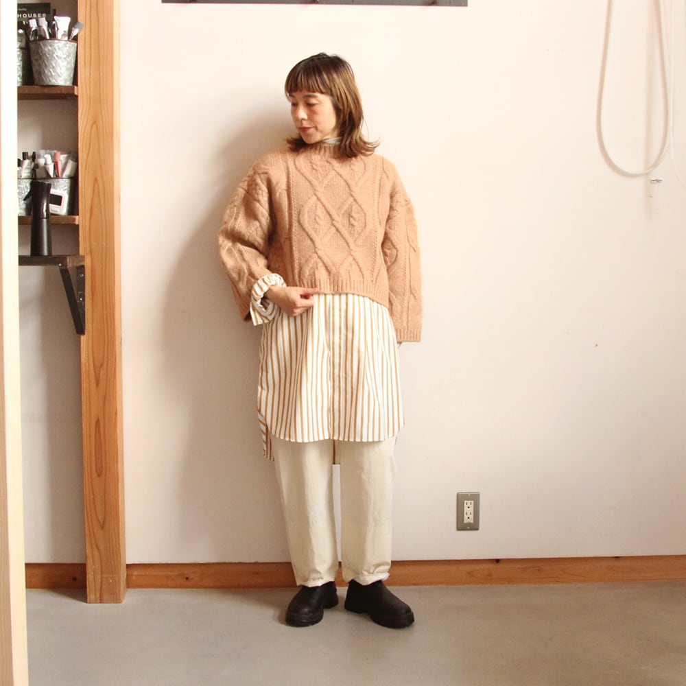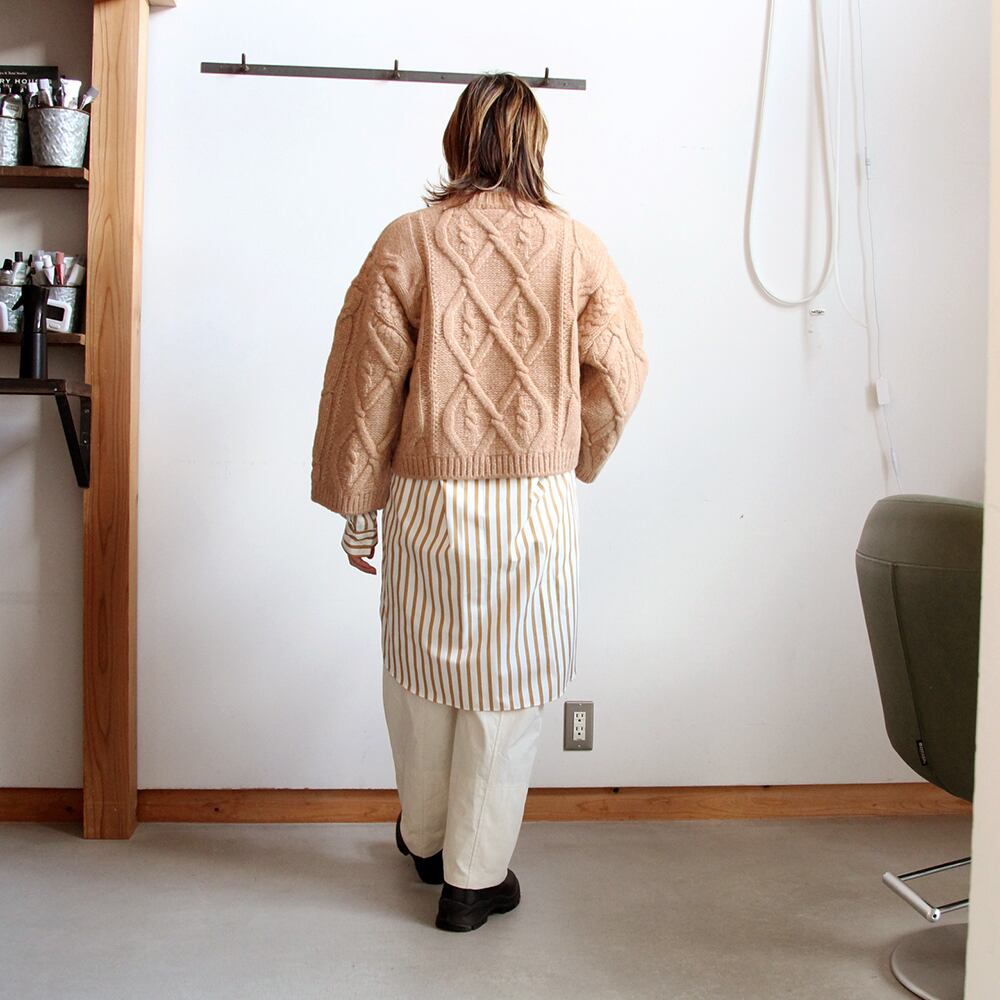 ローゲージのケーブル編みで立体感のある表情を出し、柔らかくボリューミーに仕上げました。