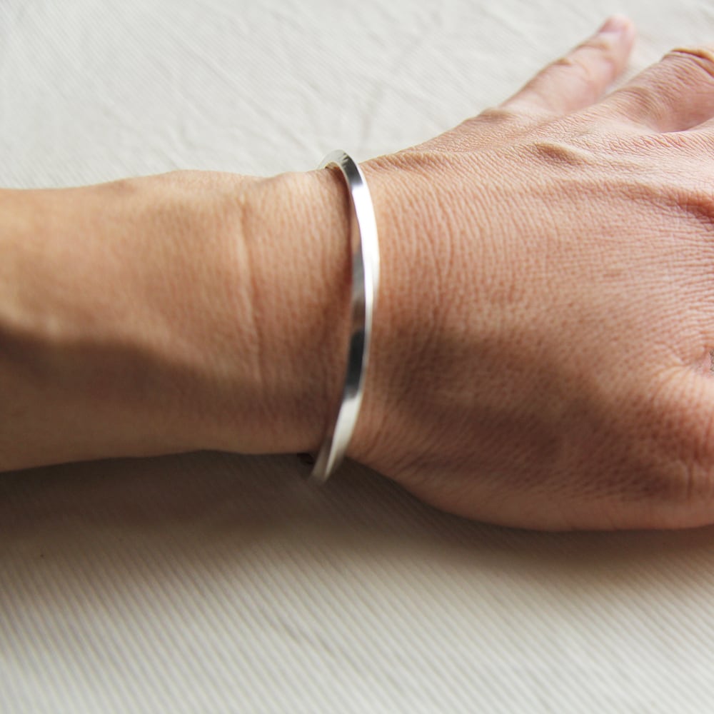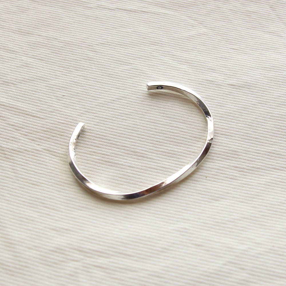 ねじれの入ったシンプルなデザインのスリムタイプのツイストバングル。表面にはハンマー加工が施され温かみのある表情でマナナスらしい軽やかな仕上がりです。コーディネートを選ばないシンプルさと滑らかな着け心地で、毎日着用できるバングルです。若干のサイズ調整は可能。ユニセックスアイテム。