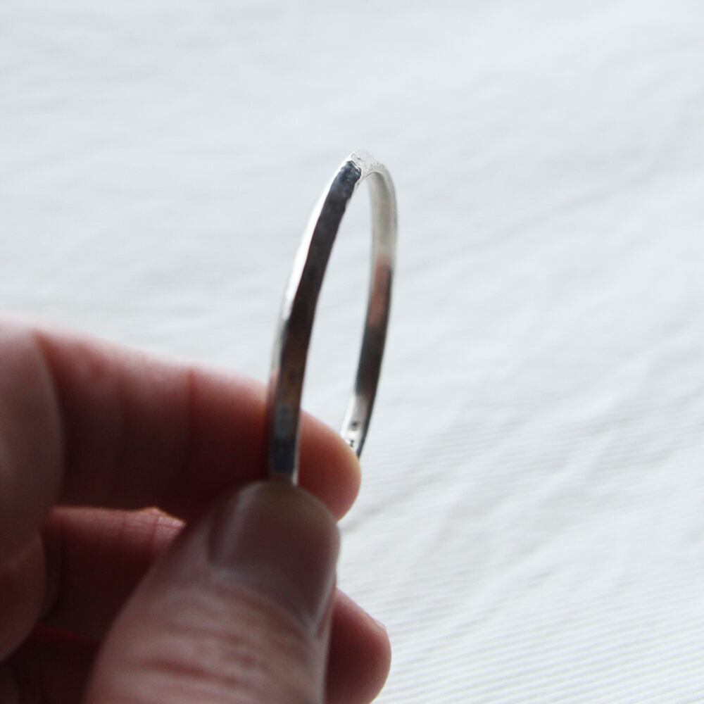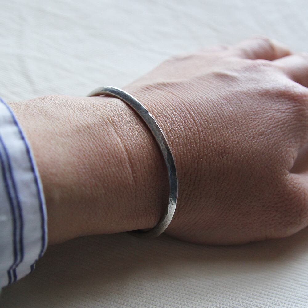 シンプルなデザインのスリムタイプのトライアングルバングル。両サイドのラインがアクセントに。表面にはハンマー加工が施され温かみのある表情に仕上がっています。コーディネートを選ばないシンプルさと滑らかな着け心地で、毎日着用できるバングルです。