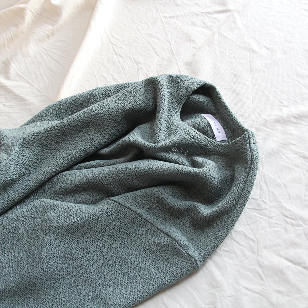 ローゲージの編機でセーターのように編み立てられたファブリック。本来ローゲージで編むと重くだれてしまうところを糸と編機のベストなバランスで軽さとハリを両立している。