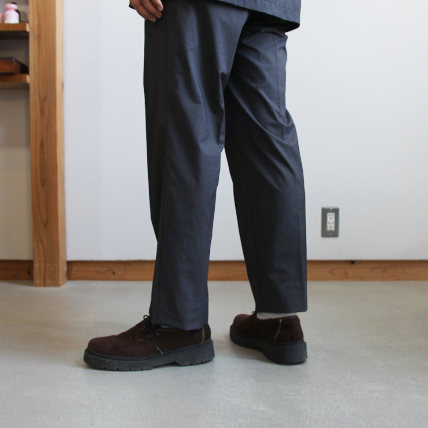 ワタリ幅と裾幅を大きくしていて、ヒップ周りもゆとりを持たせて、ウエストは変わらずに、ヒップからワタリ、裾口にかけて少しだけワイドシルエットになっています。