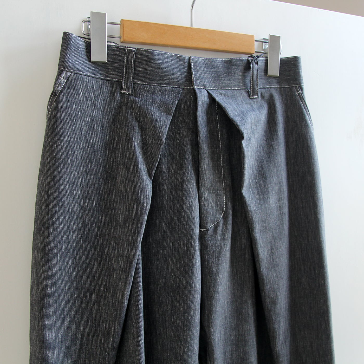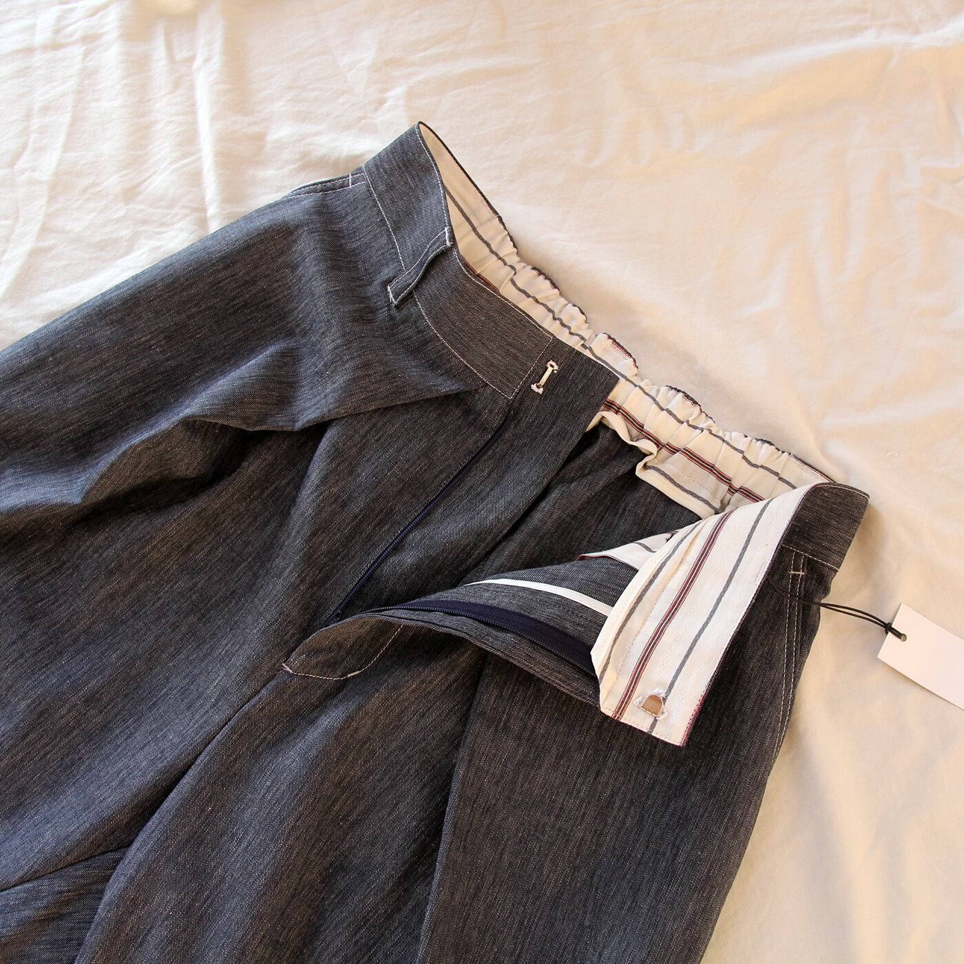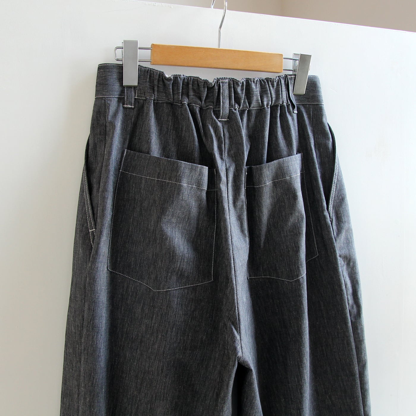 ウエストは前ファスナー+釦開きで後ゴム仕様。