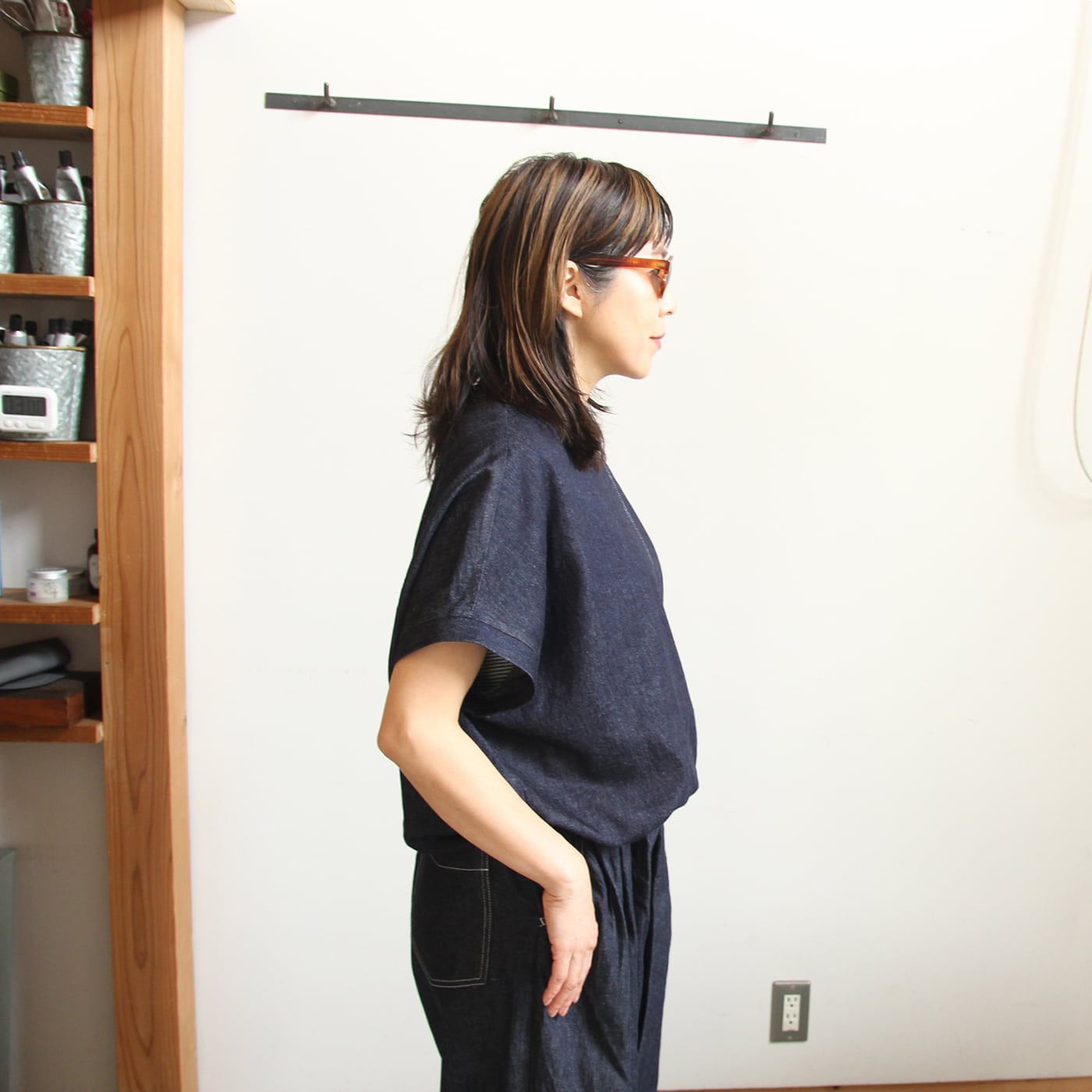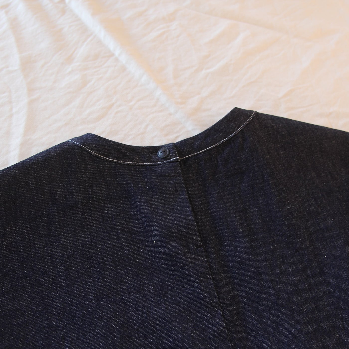 衿ぐり切替仕様にしたクルーネックの後明きプルオーバートップスです。