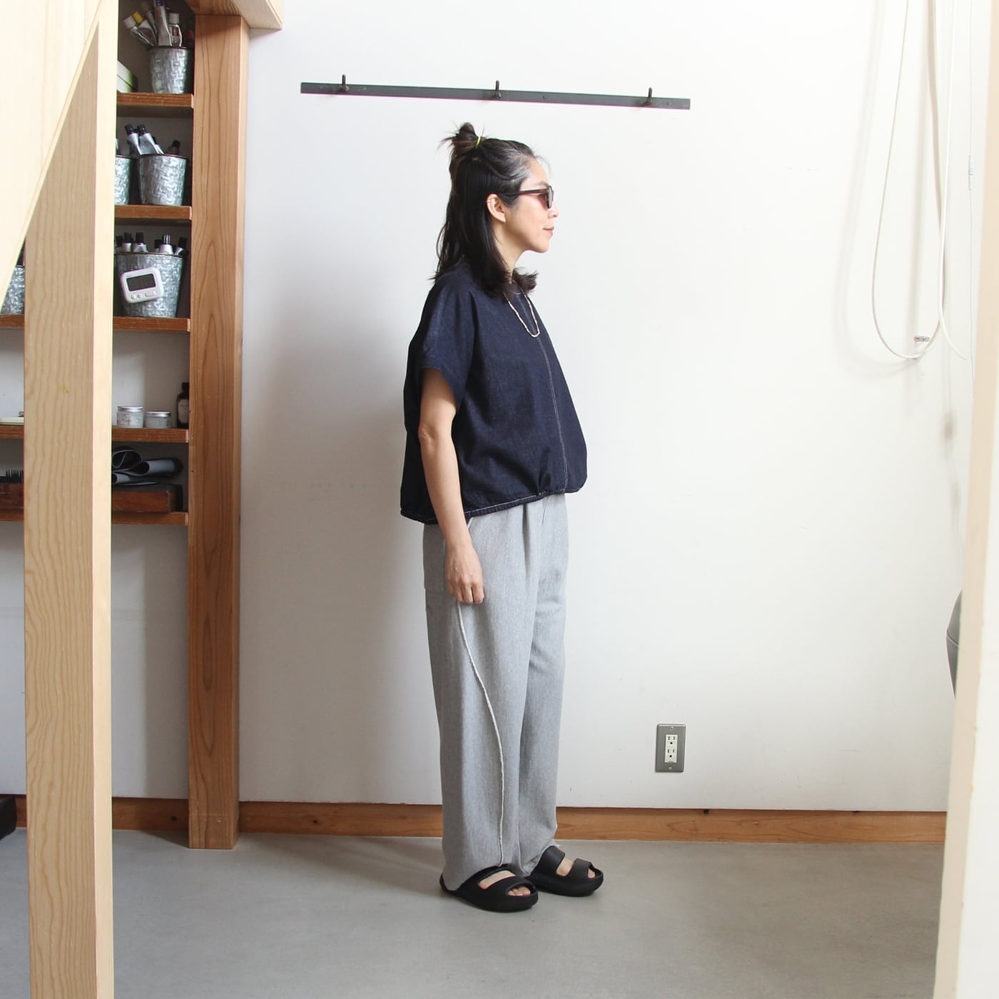 身幅は広くゆとりのある肩を落としたBOXシルエットでリラックス感を出しています。アームホールをカフスデザインで切り替えることで、ラフになりすぎないアクセントをプラス。裾にはスピンドルを通しフォルムの調整やニュアンスのアレンジが可能です。シンプルな中に構築的なディテールを備えた一着に仕上げています。